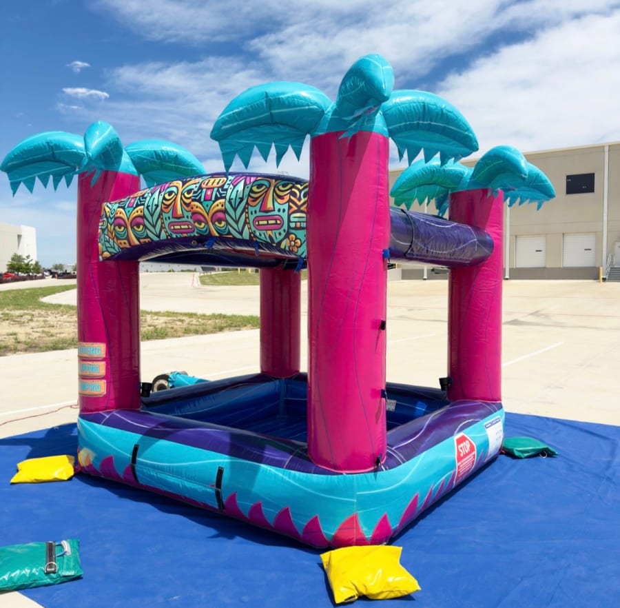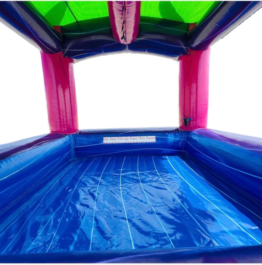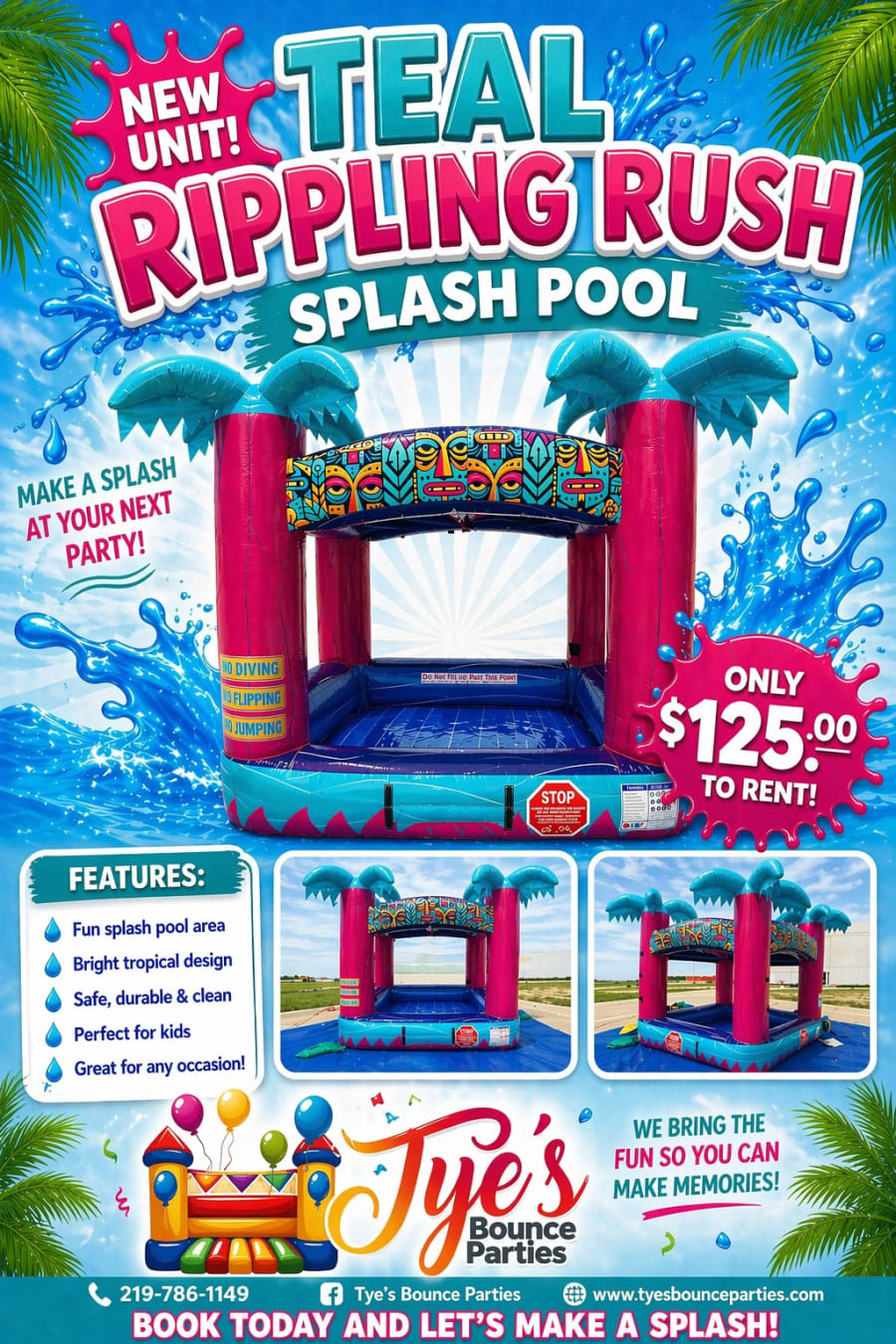 Bring island vibes to your next event with the Teal Rippling Rush Splash Pool. Bright tiki artwork, colorful palm accents, and an open play area create a fun, vacation-style centerpiece. This inflatable rental is designed for warm-weather celebrations, birthdays, luaus, and family gatherings. It’s also the perfect add-on for adults who want to cool off while kids play. For local renters, we offer the perfect with water slides Teal Rippling Rush Splash Pool in Hobart, Merrillville, Portage and Surrounding Areas in NWI.